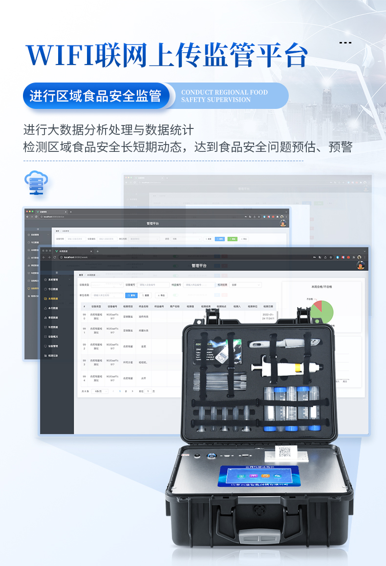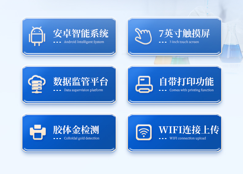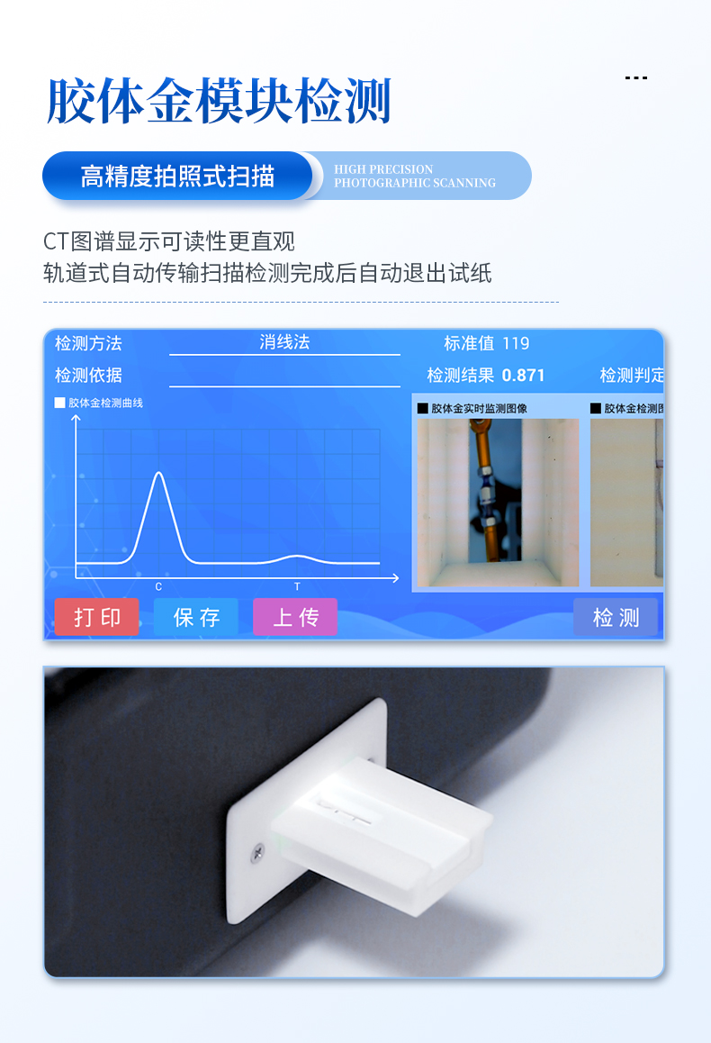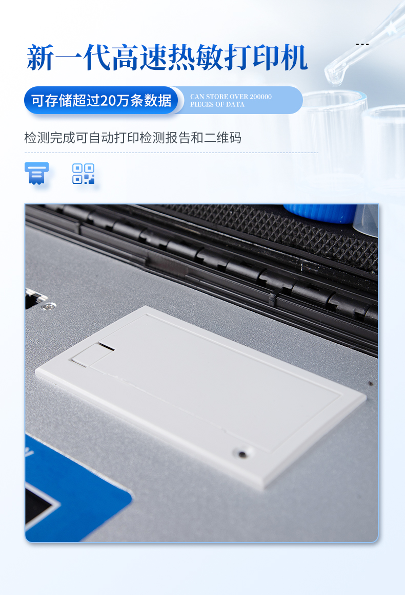 | 安卓智能操作系统,采用更加**和人性化操作,仪器具有网线连接、wifi联网上传、4G无线远传功能,快速上传数据。 | 智能化程度高,仪器具有自检功能:具有开机自检和调零功能,具有自动检测重复性功能。 | 新一代高速热敏打印机,检测完成可自动打印检测报告和二维码。 | 仪器带有监管平台。数据可局域网和互联网数据上传,检测结果直接传至食品安全监管平台。进行区域食品安全监管及大数据分析处理与数据统计,检测区域食品安全长短期动态,达到食品安全问题预估、预警。 | 一体化便携式快检设备,满足现场及流动检测使用需求,能够在同一软件下实现所有检测项目的检测,并可通过同一窗口直观显示检测结果。 | 胶体金模块检测方式:轨道式自动传输扫描,检测完成后自动退出检测卡。 | CT线自动识别,无需手动调整。 | 仪器具有品类多种类样品菜单库,可灵活选择检测样品,不同的检测通道可同时检测不同的样品项目。 | 样品处理简单省力,整体操作快速、安全、便捷。 | 仪器具有自身保护功能,可设置用户名及密码,防止非工作人员操作等。 | 高灵敏度,高检测精度,高重复性精度,扫描式高精度光学传感器。 | 内置强大的数据库,可在仪器上直接选择样品名称、检测指标、送检单位等信息,也可在仪器上直接编辑录入样品名称、检测指标、送检单位等信息并保存进样品数据库。 | 仪器具有重新校准、锁定、恢复出厂设置功能。 | 支持U盘存储。 结果判定线可修改,对照值标定值可保存,断电不丢失数据。 | 兼容市场上所有的胶体金卡,使用耗材不受限制,极大增强用户使用体验。 |