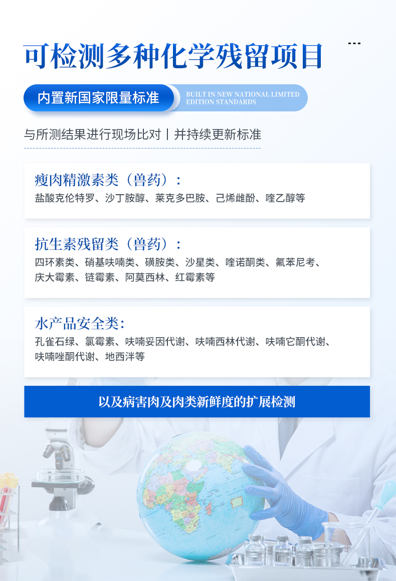 该仪器广泛应用于食药监局、卫生监督部门、农业部门、商业系统养殖场、屠宰场、食品肉产品深加工企业、畜牧兽医、检验检疫部门、食品生产企业、农副产品批发市场、农业生产基地、超市、餐厅、高教院校、食堂等单位部门对食品中的不安全指标进行监测使用。