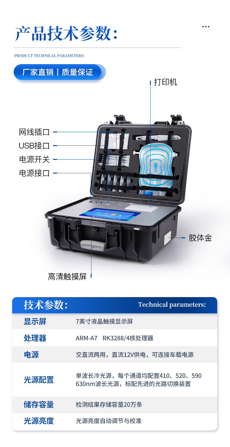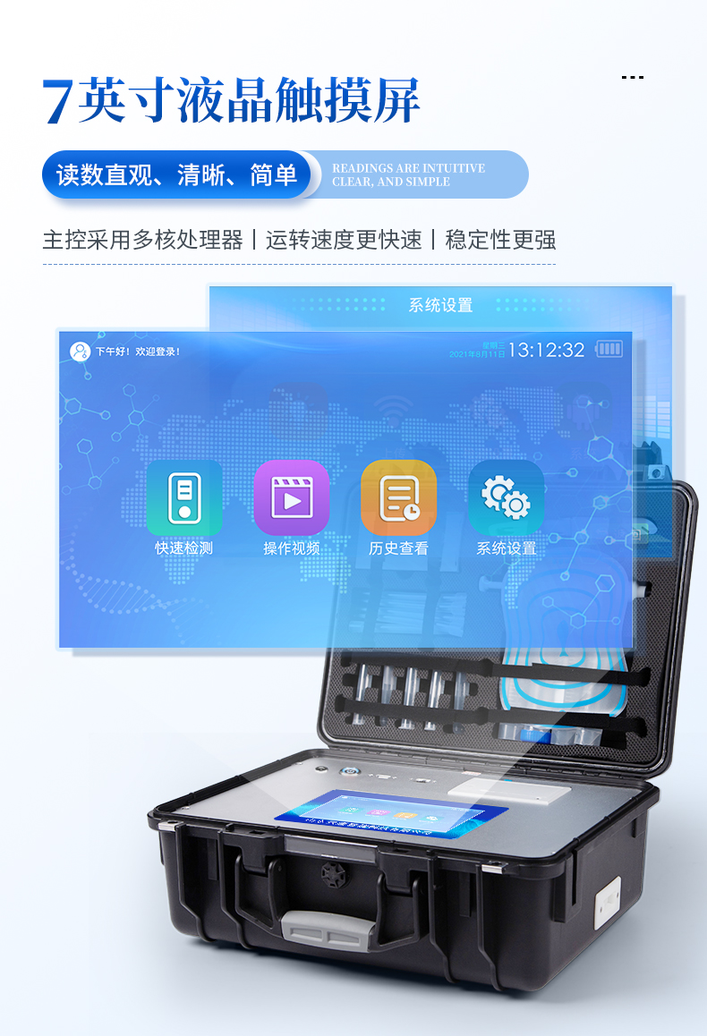 | 主控芯片采用ARM Cortex-A7,RK3288/4核处理器,主频1.88Ghz,运转速度更快速,稳定性更强。 | 显示方式:7英寸液晶触摸屏显示,人性化中文操作界面,读数直观、简单。 | 交直流两用,直流12V供电,可连接车载电源,可配6ah大容量充电锂电池,方便户外流动测试。 | 光源亮度自动调节与校准 | 智能恒流稳压,光强自动校准,长时间连续工作光源无温漂现象。 | 内置新国家限量标准,与所测结果进行现场比对,并持续更新标准。 | 不间断进样,连续检测 | 样本编号自动累加。 | 检测项目可扩充。 | 检测结果可批量打印,批量上传。 | 检测结果为Excel表格,连接电脑即可拷贝。 | 检测结果存储容量20万条 | 标准USB接口,免驱动安装。 | 固件可升级 |