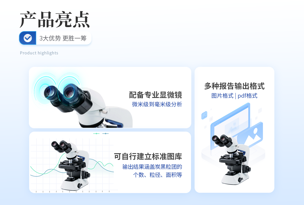 1、采用专业图像分析法由计算机完成炭黑分散度等级的判定,检测精度高。 | 2、对目标炭黑粒径可从微米级到毫米级进行分析 | 3、 配备专业显微镜,配以500万CMOS图像传输器 | 4、可单张保存图像,图像大小由640*480,1024*768,1280*1024,2592*1944四种大小可供选择 | 5、丰富的图像处理功能,满足多种图像处理需要 | 6、软件具有自动和手动两种方式进行炭黑图像分割 | 7、软件可满足对局部分析的要求 | 8、配备测微标尺,可进行像素点尺寸校准,并且软件具有移动标尺功能,可进行任意两点距离测量 | 9、客户可以自行建立标准图库 | 10、输出结果涵盖炭黑粒团的个数、粒径、面积等,并可以数据报表和excel的形式进行输出 | 11、提供图像灰阶分布图、粒子径分布图、粒度分布图 | 12、报告结果包括:样品名、标准名、原始图像、灰阶图等。报告输出格式多样,可以选择图片格式或pdf格式进行保存。 | 13、软件试用各种主流操作系统,与win7/win10/winXP等有很好兼容性。 | 14、采用usb2.0数据接口,可适配多种采集设备(如:摄像头或数码相机) |