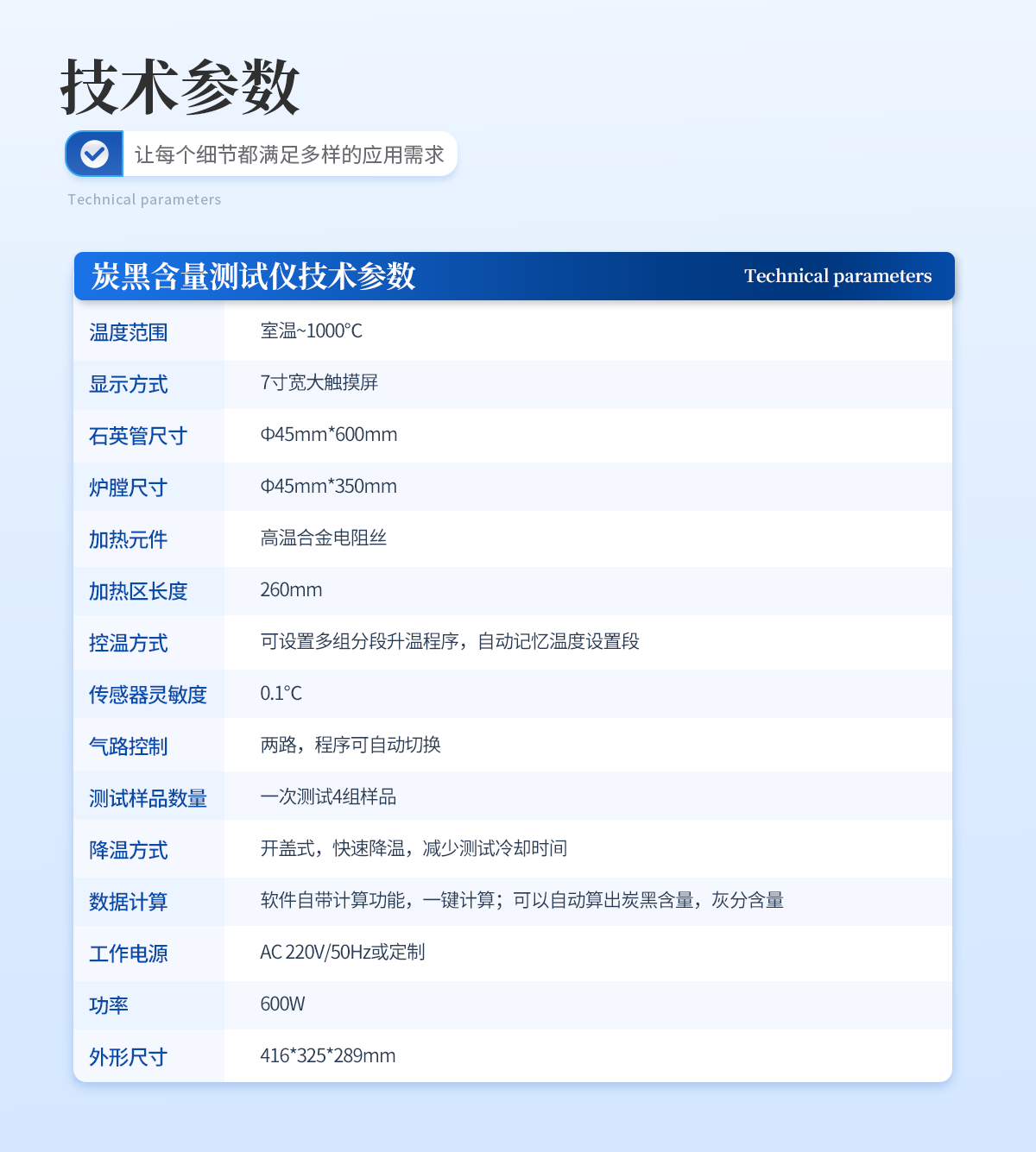 1.温度范围:室温~1000℃ | 2. 显示方式:7寸宽大触摸屏 | 3.石英管尺寸:Ф45mm*600mm | 4. 炉膛尺寸:Φ45mm*350mm | 5.加热元件:高温合金电阻丝 | 6.加热区长度:260mm | 7.控温方式:可设置多组分段升温程序,自动记忆温度设置段 | 8. 传感器灵敏度:0.1℃ | 9.气路控制:两路,程序可自动切换 | 10. 测试样品数量:一次测试4组样品 | 11.降温方式:开盖式,快速降温,减少测试冷却时间 | 12.数据计算:软件自带计算功能,一键计算;可以自动算出炭黑含量,灰分含量 | 13.工作电源 AC:220V/50Hz或定制 | 14.功率:600W | 15.外形尺寸:416*325*289mm |