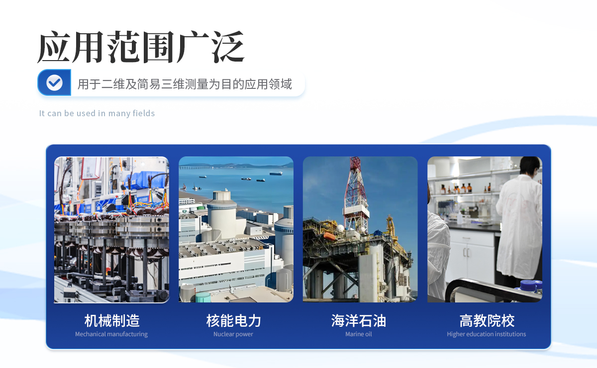 广泛应用于机械、电子、模具、注塑、五金、橡胶、低压电器,新能源、磁性材料、精密五金、精密冲压、接插件、连接器、端子、手机、家电、计算机、液晶电视、印刷电路板(线路板、PCB)、汽车、医疗器械、钟表、螺丝、弹簧、仪器仪表、齿轮、凸轮、螺纹、半径样板、螺纹样板、电线电缆、刀具、轴承、筛网、试验筛、水泥筛、网板(钢网、SMT模板)等。
