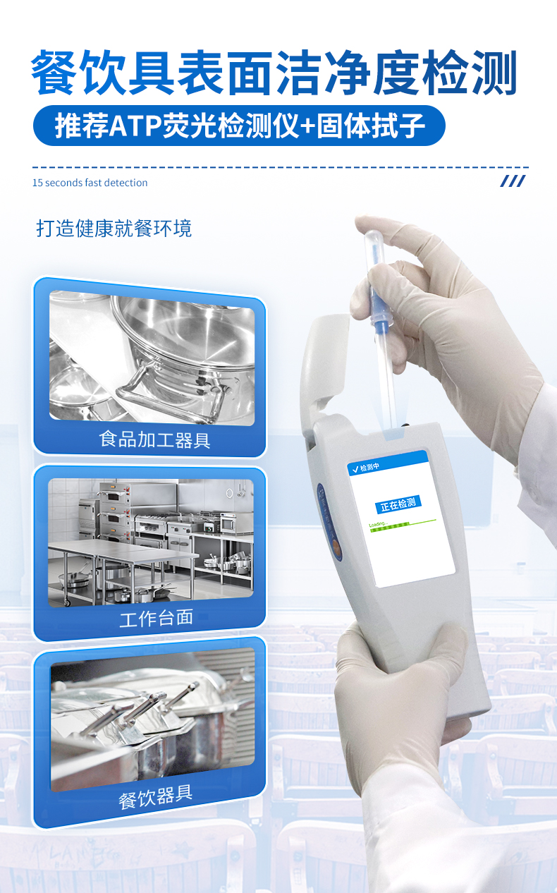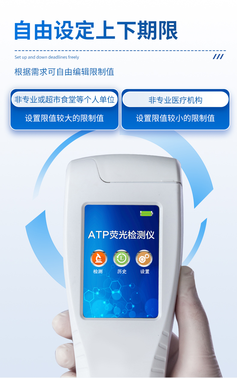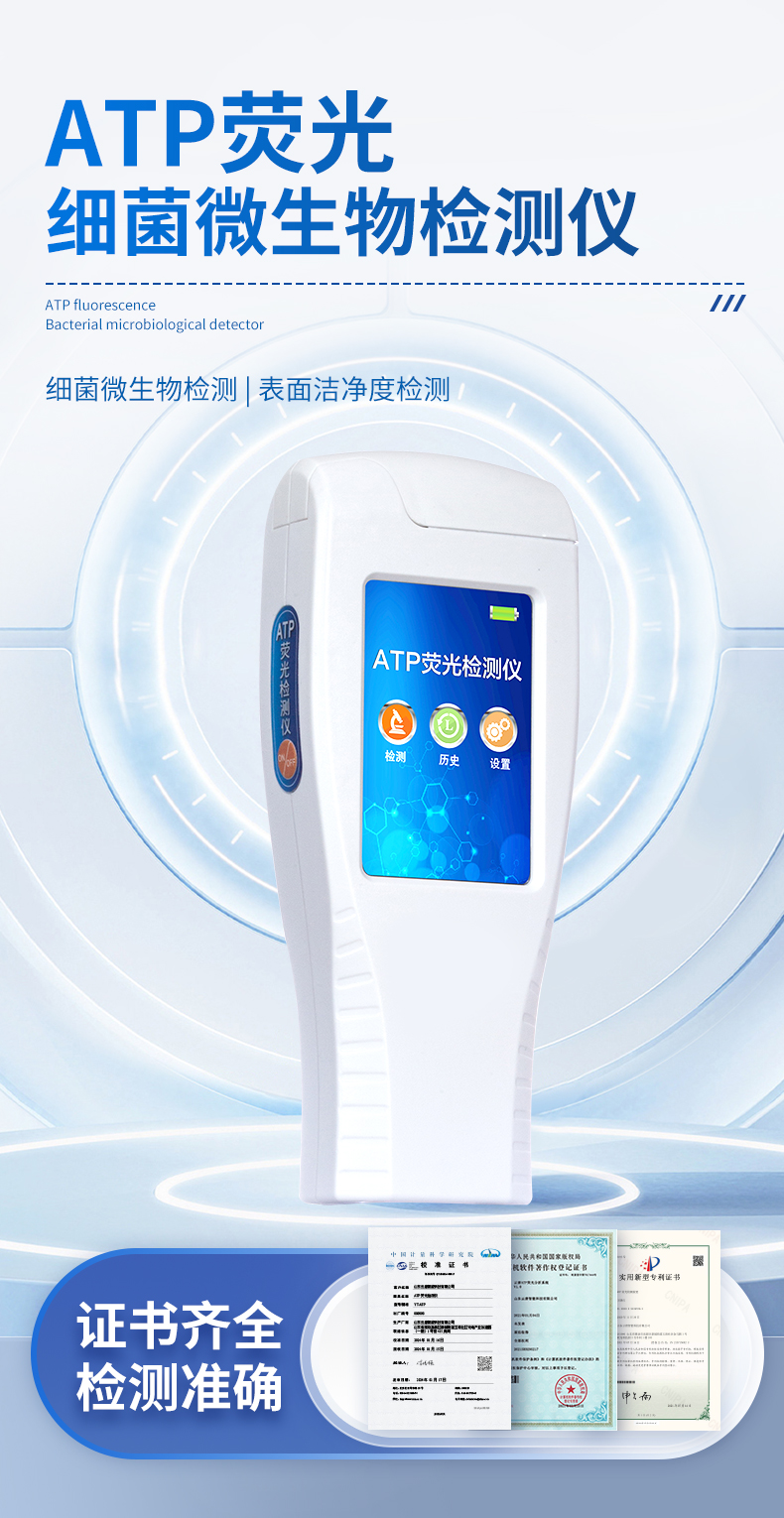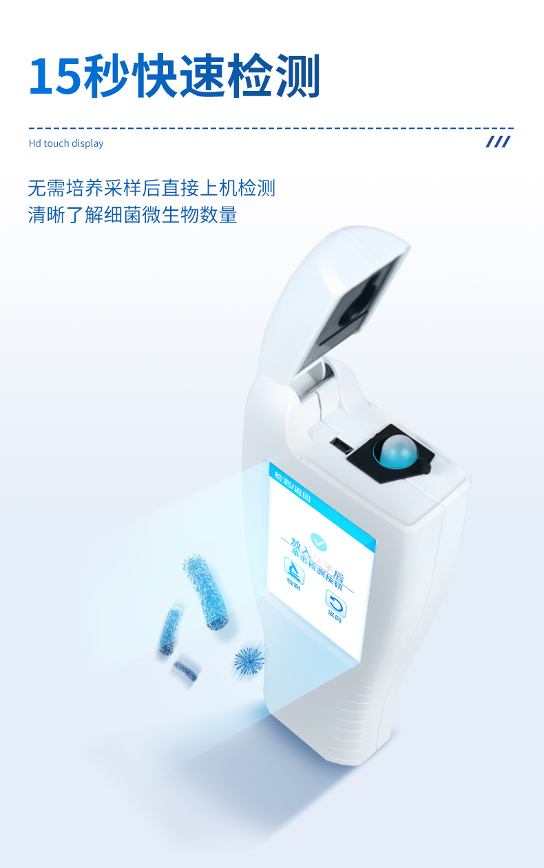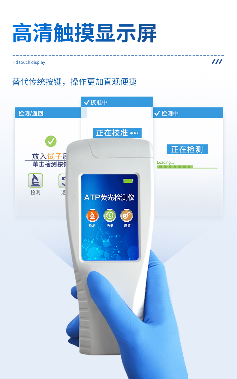 该设备为全新升级产品,大屏幕触摸显示屏,代替传统按键。操作采用生物化学反应方法检测ATP含量,ATP荧光检测仪基于萤火虫发光原理,利用“荧光素酶—荧光素体系”快速检测三磷酸腺苷(ATP)。ATP拭子含有可以裂解细胞膜的试剂,能将细胞内ATP释放出来,与试剂中含有的特异性酶发生反应,产生光,再用荧光照度计检测发光值,微生物的数量与发光值成正比,由于所有生物活细胞中含有恒量的ATP,所以ATP含量可以清晰地表明样品中微生物与其他生物残余的多少,用于判断卫生状况。