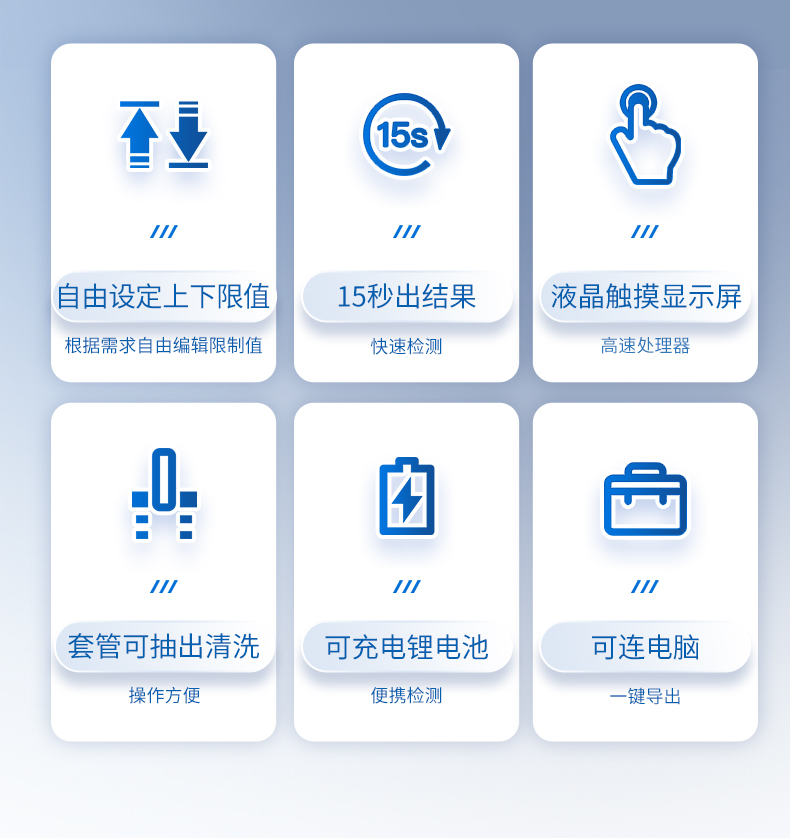 | 实用性 —— 可根据环境检测需求设定上下限值,做到数据快速评估预警,表面洁净度快速筛查。 | 灵敏度高 —— *************** | 速度快 —— 常规培养法18-24h以上,而ATP只需要十几秒钟 . | 可行性 —— 微生物数量与微生物体内所含ATP有明确的相关性。 通过检测ATP含量,可间接得出反应中微生物数量 | 可操作性 —— 传统培养方法需要在实验室由经过培训的技术人员进行操作;而ATP快速洁净度检测操作非常简便,只需简单的培训即可由一般工作人员进行现场操作。 | 体验更好 —— 试子套管采用插拔式灵活设计,可定期清洗长期使用,延长仪器寿命。 |