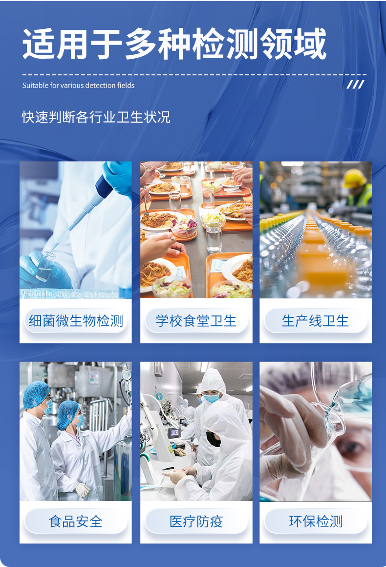 云唐ATP荧光检测仪广泛应用于:细菌微生物检测、医药卫生、食品安全、市场执法、表面洁净度检测、医疗防疫、水质水政、生产线卫生、工业水处理、环保检测、海关出入境检疫及其他执法部门等多种行业。