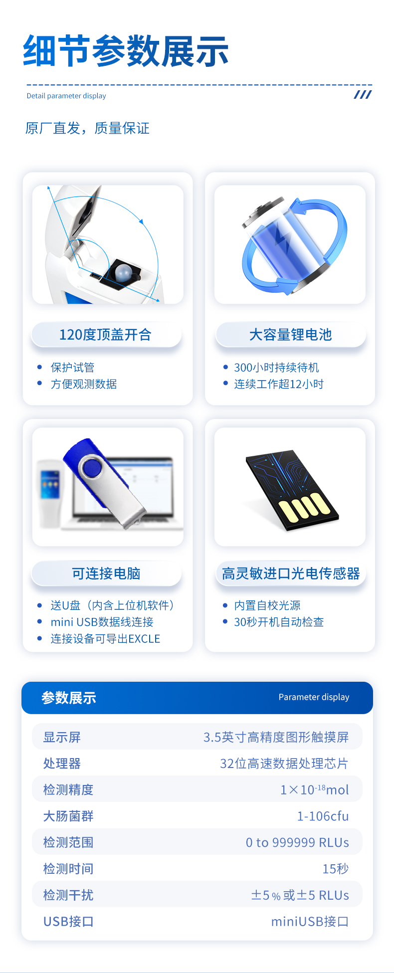 | 1、操作程序:安卓系统,可中英文切换 | 2、显示屏:3.5英寸高精度图形触摸屏 | 3、处理器:ARM Cortex-A7,主频1.88Ghz,4核高速芯片 | 4、检测精度:********** | 5、大肠菌群:******** | 6、检测范围:**************** | 7、检测时间:15秒 | 8、检测干扰:±5﹪或±5 RLUs | 9、操作温度范围:5℃到40℃ | 10、操作湿度范围:20—85﹪ | 11、ATP回收率:90-110% | 12、检出模式:RLU、大肠菌群筛查 | 13、数据存储:4G内存可存储10万条数据 | 14、可任意设定上限值,下限值 | 15、自动判断合格与不合格 | 16、自动统计合格率 | 17、内置自校光源 | 18、开机30秒自检 | 19、配有miniUSB接口,可将结果上传至PC | 20、具有wifi、蓝牙传输功能,可将结果无线上传数据分析平台 | 21、同时配备专用软件驱动U盘代替传统光盘 | 22、仪器尺寸(W×H×D):188 mm×77mm×37mm | 23、使用可充电锂电池免电池更换 | 24、备用状态(20℃):6个月 | 25、中英文操作手册 | 26、稳定的液体荧光素酶 | 27、润湿的一体化采集拭子 |