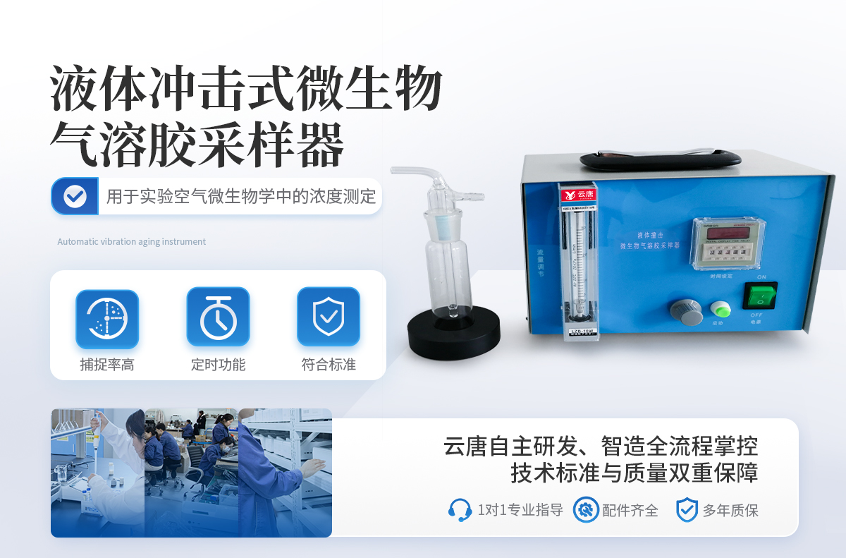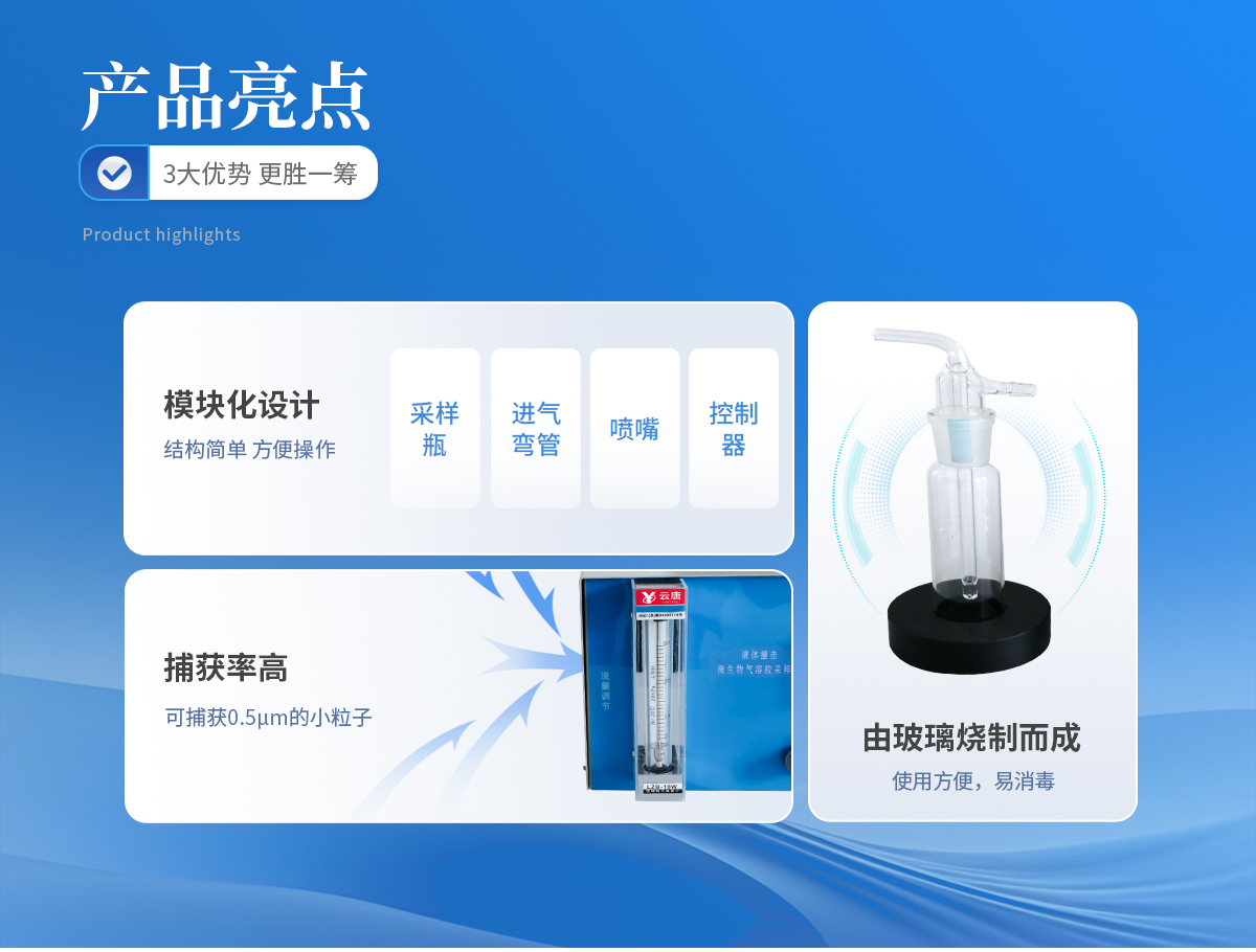 液体冲击式微生物气溶胶采样器 (又称:液体撞击式采样器)是全玻璃制造,由采样瓶、进气弯管、喷嘴、控制器组成结构是有一呈90度弧型弯曲的进气管和一盛采样液体的外瓶。进气管上部的弯管,是模拟人的上呼吸道对气溶胶粒子的阻拦。在管的末端有一微孔喷嘴, 气流经此速度变快可达声速,利用喷射气流将空气中的微生物粒子采集于液体采样介质中。由于液体的粘附性,将微生物粒子捕获。