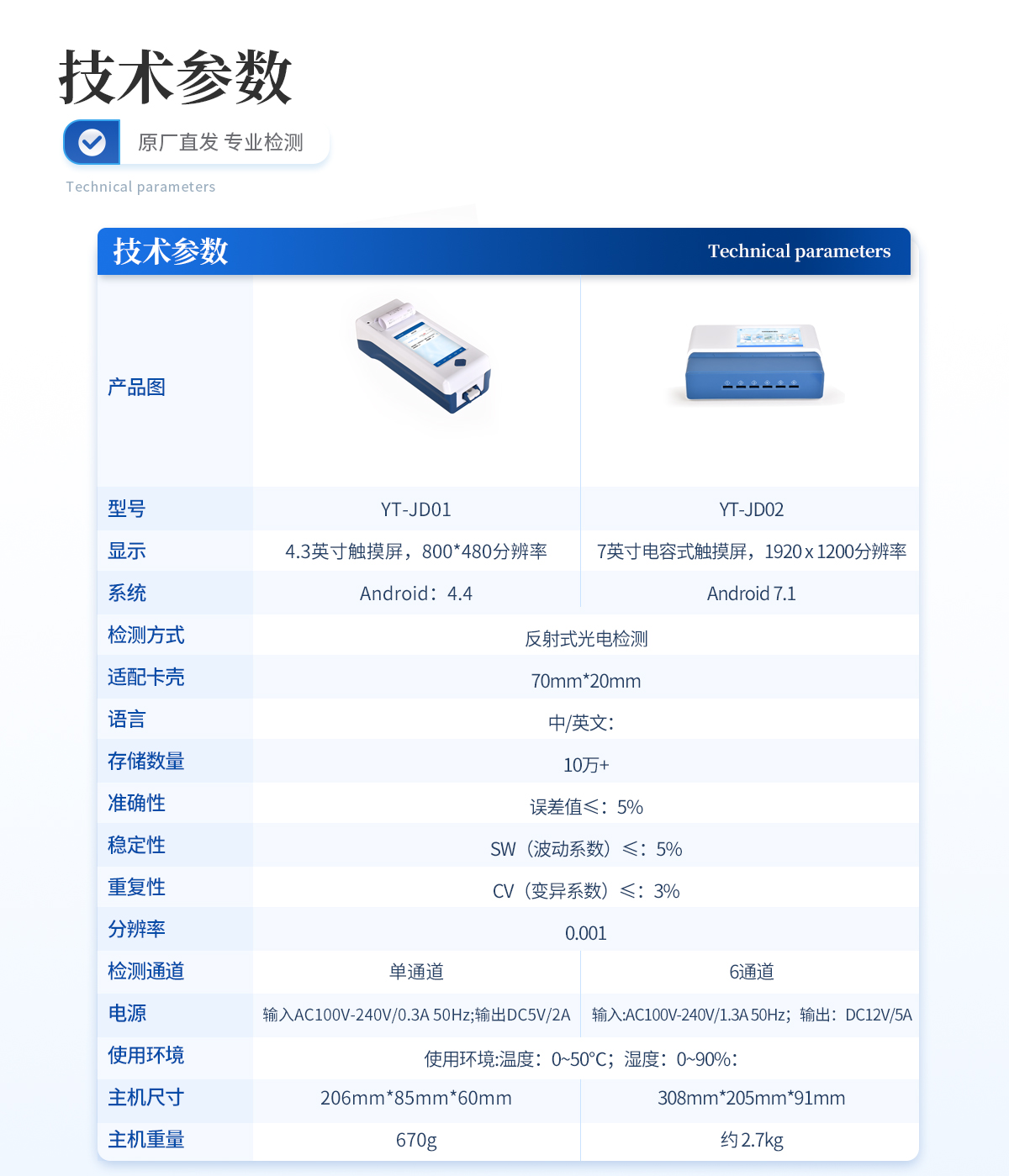 | 1、 ★通道同时支持胶体金检测卡和荧光检测卡的检测,无需切换模块 | 2、 ★多通道单卡+多联卡设计方案,显著提升检测效率,满足批量样本快速处理需求; | 3、 Android触控系统结合大尺寸高清屏幕,界面友好,操作简单流畅,无需外接设备; | 4、 可存储500万条检测结果,支持按日期灵活查询、预览、删除结果,并生成多样化专业报告。 | 5、 内置热敏打印机,检测完成即可现场打印标准报告,提升工作效率。 | 6、 关键部件实时自诊断功能,保障仪器长期稳定运行。 | 7、 高速有线/无线网络及蓝牙,构建完善的数据监控平台,实现数据实时上传、远程查询、统计分析和监管协同。 | 8、 丰富的接口设计,轻松连接电脑、U盘、网络及上位机系统,支持U盘导出。 | 9、 孵育模块为特定试纸条反应提供**温度环境。 | 10、 流线型结构,紧凑轻便,兼顾实验室耐用性与检测需求。 | 11、 二维码扫描录入样本信息,避免人工错误 | 12、 插卡判断:检测卡未插入检测通道不能内置质控功能,可设备送检、设备自检、试剂卡自检测方式:孵育检测、即时检测(对检测数据复检核实) | 13、 检测曲线:可以对试剂卡的检测核验,防止误判 | 14、 检测结果:报告出检测项目、被测物质的浓度、检测单位、被检查单位、检验员、检测时间、检测限等信息可在触摸屏上显示,可通过仪器内置打印机输出 | 15、 项目管理:支持检测项目拓展功能 | 16、 界面设置:可修改标题和页尾信息,灵活展示仪器信息 |