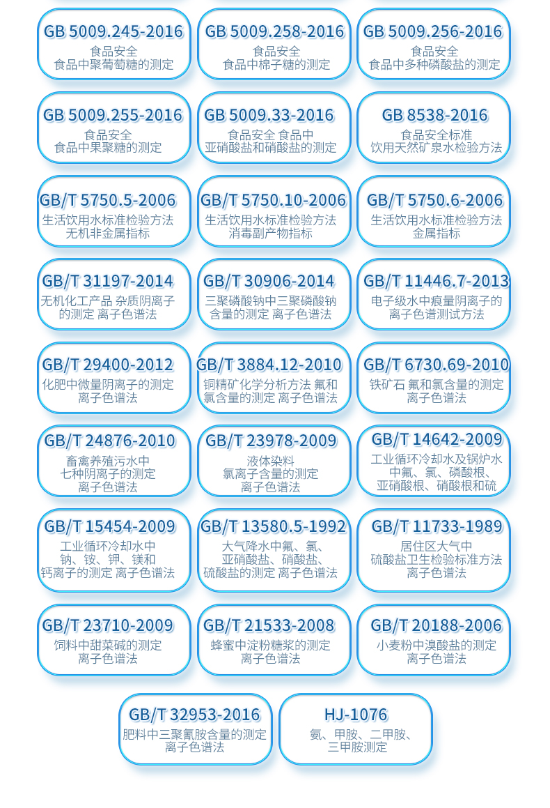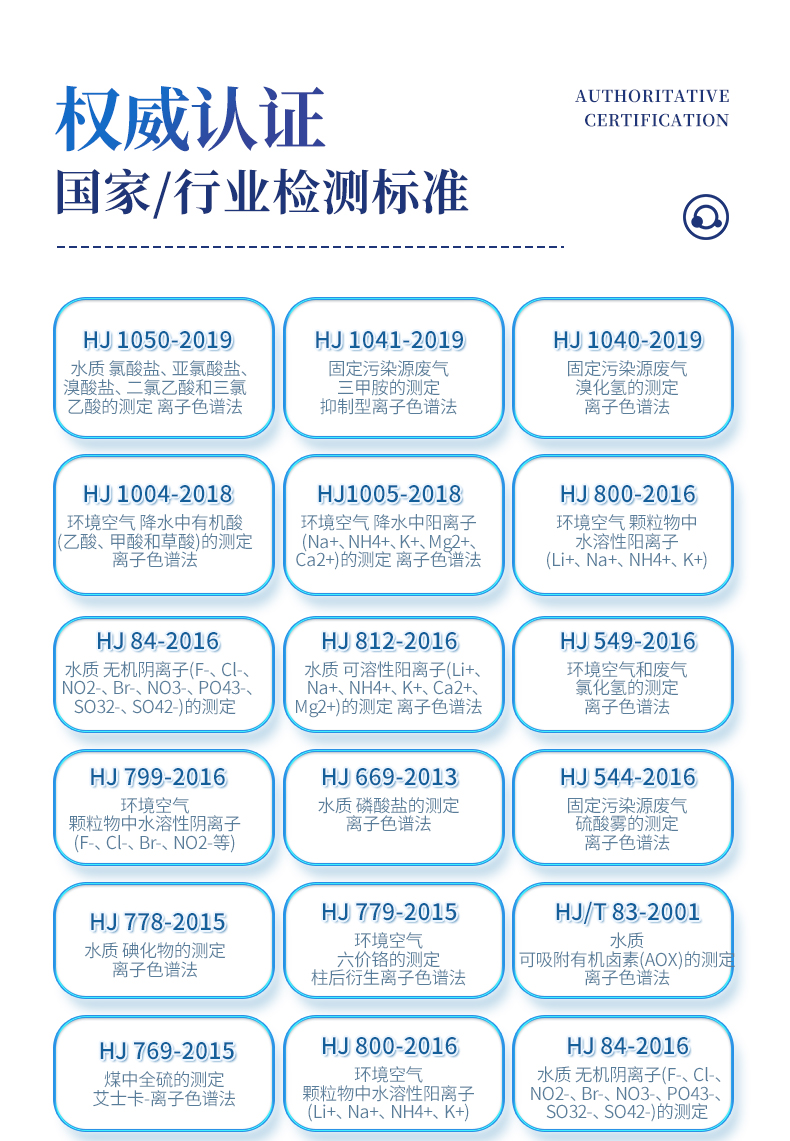 | HJ 1050-2019:水质 氯酸盐、亚氯酸盐、溴酸盐、二氯乙酸和三氯乙酸的测定 离子色谱法 | HJ 1041-2019 固定污染源废气 三甲胺的测定 抑制型离子色谱法 | HJ 1040-2019 固定污染源废气 溴化氢的测定 离子色谱法 | HJ 1004-2018 环境空气 降水中有机酸(乙酸、甲酸和草酸)的测定 离子色谱法 | HJ1005-2018 环境空气 降水中阳离子(Na+、NH4+、K+、Mg2+、Ca2+)的测定 离子色谱法 | HJ 800-2016 环境空气 颗粒物中水溶性阳离子(Li+、Na+、NH4+、K+) | HJ 84-2016 水质 无机阴离子(F-、Cl-、NO2-、Br-、NO3-、PO43-、SO32-、SO42-)的测定 | HJ 812-2016 水质 可溶性阳离子(Li+、Na+、NH4+、K+、Ca2+、Mg2+)的测定 离子色谱法 | HJ 549-2016 环境空气和废气 氯化氢的测定 离子色谱法 | HJ 799-2016 环境空气 颗粒物中水溶性阴离子(F-、Cl-、Br-、NO2-等) | HJ 669-2013 水质 磷酸盐的测定 离子色谱法 | HJ 544-2016 固定污染源废气 硫酸雾的测定 离子色谱法 | HJ 778-2015 水质 碘化物的测定 离子色谱法 | HJ 779-2015 环境空气 六价铬的测定 柱后衍生离子色谱法 | HJ/T 83-2001 水质 可吸附有机卤素(AOX)的测定 离子色谱法 | HJ 769-2015 煤中全硫的测定 艾士卡-离子色谱法 | HJ 800-2016 环境空气 颗粒物中水溶性阳离子(Li+、Na+、NH4+、K+) | HJ 84-2016 水质 无机阴离子(F-、Cl-、NO2-、Br-、NO3-、PO43-、SO32-、SO42-)的测定 | GB 5009.245-2016 食品安全 食品中聚葡萄糖的测定 | GB 5009.258-2016 食品安全 食品中棉子糖的测定 | GB 5009.256-2016 食品安全 食品中多种磷酸盐的测定 | GB 5009.255-2016 食品安全 食品中果聚糖的测定 | GB 5009.33-2016 食品安全 食品中亚硝酸盐和硝酸盐的测定 | GB 8538-2016 食品安全标准 饮用天然矿泉水检验方法 | GB/T 5750.5-2006 生活饮用水标准检验方法 无机非金属指标 | GB/T 5750.10-2006 生活饮用水标准检验方法 消毒副产物指标 | GB/T 5750.6-2006 生活饮用水标准检验方法 金属指标 | GB/T 31197-2014 无机化工产品 杂质阴离子的测定 离子色谱法 | GB/T 30906-2014 三聚磷酸钠中三聚磷酸钠含量的测定 离子色谱法 | GB/T 11446.7-2013 电子级水中痕量阴离子的离子色谱测试方法 | GB/T 29400-2012 化肥中微量阴离子的测定 离子色谱法 | GB/T 3884.12-2010 铜精矿化学分析方法 第12部分:氟和氯含量的测定 离子色谱法 | GB/T 6730.69-2010 铁矿石 氟和氯含量的测定 离子色谱法 | GB/T 24876-2010 畜禽养殖污水中七种阴离子的测定 离子色谱法 | GB/T 23978-2009 液体染料 氯离子含量的测定 离子色谱法 | GB/T 14642-2009 工业循环冷却水及锅炉水中氟、氯、磷酸根、亚硝酸根、硝酸根和硫 | GB/T 15454-2009 工业循环冷却水中钠、铵、钾、镁和钙离子的测定 离子色谱法 | GB/T 23710-2009 饲料中甜菜碱的测定 离子色谱法 | GB/T 21533-2008 蜂蜜中淀粉糖浆的测定 离子色谱法 | GB/T 20188-2006 小麦粉中溴酸盐的测定 离子色谱法 | GB/T 13580.5-1992 大气降水中氟、氯、亚硝酸盐、硝酸盐、硫酸盐的测定 离子色谱法 | GB/T 32953-2016 肥料中三聚氰胺含量的测定 离子色谱法 | GB/T 11733-1989 居住区大气中硫酸盐卫生检验标准方法 离子色谱法 | HJ-1076 氨、甲胺、二甲胺、三甲胺测定 |
