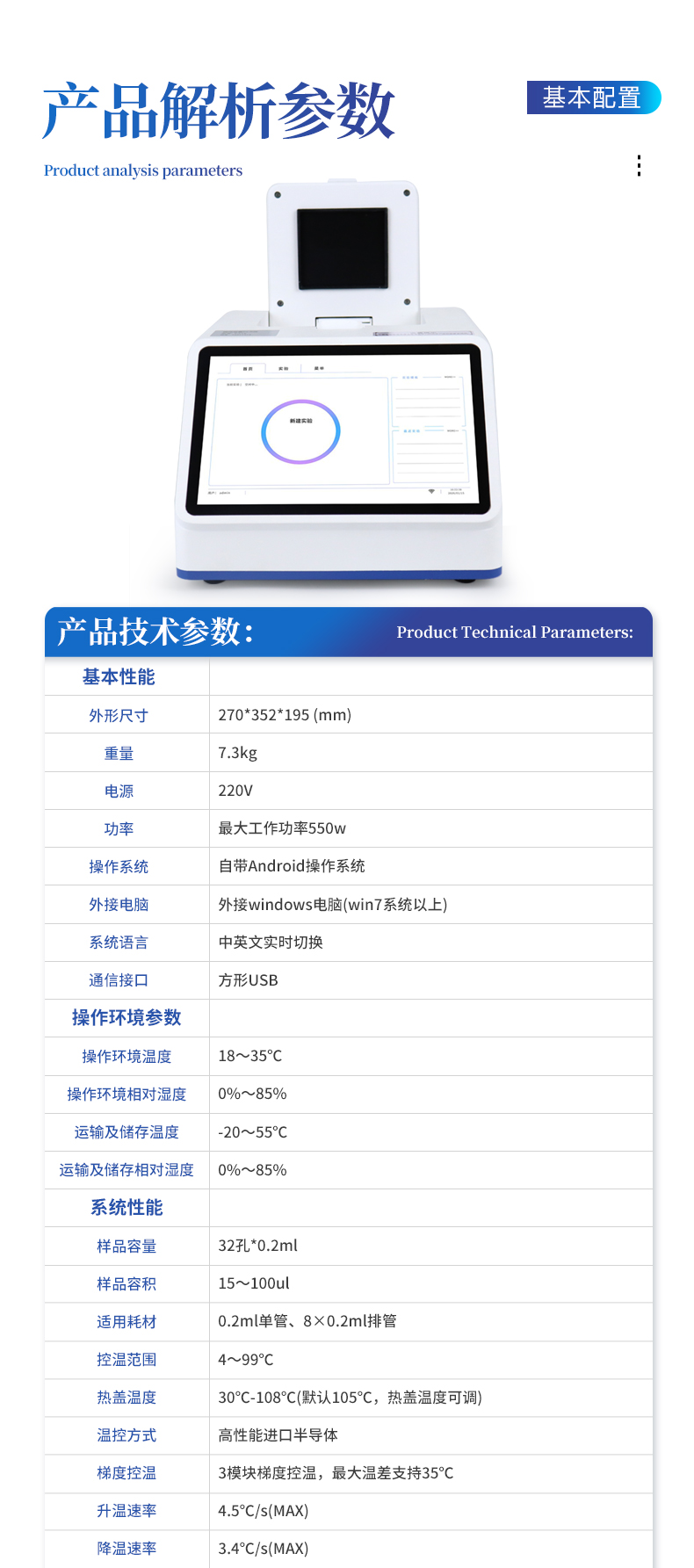 | 1.智能操作系统,实验尽在掌握 | A双模式灵活控制:支持通过仪器触摸屏独立运行,也支持通过电脑软件进行远程控制与数据管理,适应不同实验场景需求。 | B程序更新与预设:支持在线更新实验程序,并内置丰富的预设实验程序模板,用户亦可自定义保存常用模版,实现一键快速启动,极大提升操作效率。 | C极简启动体验(可选配):可定制集成摄像头扫描系统,用户只需扫描样品板或程序卡的二维码,即可自动识别并调用对应实验程序,简化流程,避免人为设置错误。 | D操作简单:无论是触摸屏界面还是电脑软件,均设计得直观易懂,新用户也能快速上手。预置常用程序模板,进一步简化操作流程。 | 2.精准稳定的温控与光学核心 | A长久精准的温控系统:采用进口***TEC半导体制冷模块,控温精准(±0.1°C),孔间温度均匀性**(≤±0.3°C)。系统稳定性卓越,长期使用性能衰减小,校准周期长达数年,显著降低维护成本与运营中断。 | B免维护的灵敏光学系统:配备4个独立LED光源与4个独立光电二极管检测器,实现四通道荧光同步精准检测。采用超长寿命进口光源,设计寿命期内免维护,无需额外校准或更换,保障检测结果长期一致性与高灵敏度。 | C卓越的数据质量:实验线性相关性高(R²≥0.999),重复性优异(孔间CV值低),确保定量结果准确可靠,数据置信度高 | 3.**便捷的数据与输出管理 | A多重数据导出方式:支持通过USB存储设备直接拷贝,或经由Wi-Fi无线网络传输数据至本地服务器或云端,方便灵活,满足各类实验室数据管理习惯。 | B丰富的报告导出与打印:支持生成并导出多种格式(如PDF、Excel)的实验报告。仪器兼容USB热敏打印机、蓝牙无线打印机及常规A4打印机,可直接在仪器上或通过电脑一键导出并打印专业报告,便于结果存档与即时分享。 | 4.快速**与坚固耐用 | A升降温速度快:优化设计的温控系统具备高速升降温能力,显著缩短单次循环与整体检测时间,提升实验通量。 | B超长使用寿命:核心部件均选用工业级耐用材料与设计,整机运行稳定可靠,致力于为用户提供长久的投资回报。 |