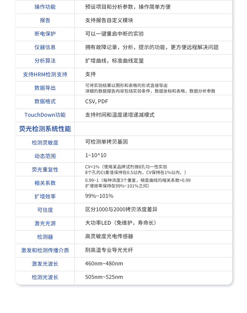 | 1.智能操作系统,实验尽在掌握 | A程序更新与预设:支持在线更新实验程序,并内置丰富的预设实验程序模板,用户亦可自定义保存常用模版,实现一键快速启动,极大提升操作效率。 | B操作简单:无论是触摸屏界面还是电脑软件,均设计得直观易懂,新用户也能快速上手。预置常用程序模板,进一步简化操作流程。 | 2.精准稳定的温控与光学核心 | A长久精准的温控系统:采用进口***TEC半导体制冷模块,控温精准(±0.1°C),孔间温度均匀性**(≤±0.3°C)。系统稳定性卓越,长期使用性能衰减小,校准周期长达数年,显著降低维护成本与运营中断。 | B免维护的灵敏光学系统:配备单个独立LED光源与单个独立光电二极管检测器,采用超长寿命进口光源,设计寿命期内免维护,无需额外校准或更换,保障检测结果长期一致性与高灵敏度。 | C卓越的数据质量:实验线性相关性高(R²≥0.999),重复性优异(孔间CV值低),确保定量结果准确可靠,数据置信度高。 | 3.**便捷的数据与输出管理 | A多重数据导出方式:支持通过USB存储设备直接拷贝,或经由Wi-Fi无线网络传输数据至本地服务器或云端,方便灵活,满足各类实验室数据管理习惯。 | B丰富的报告导出与打印:支持生成并导出多种格式(如PDF、Excel)的实验报告。仪器兼容USB热敏打印机、蓝牙无线打印机及常规A4打印机,可直接在仪器上或通过电脑一键导出并打印专业报告,便于结果存档与即时分享。 | 4.快速**与坚固耐用 | A升降温速度快:优化设计的温控系统具备高速升降温能力,显著缩短单次循环与整体检测时间,提升实验通量。 | B超长使用寿命:核心部件均选用工业级耐用材料与设计,整机运行稳定可靠,致力于为用户提供长久的投资回报。 |