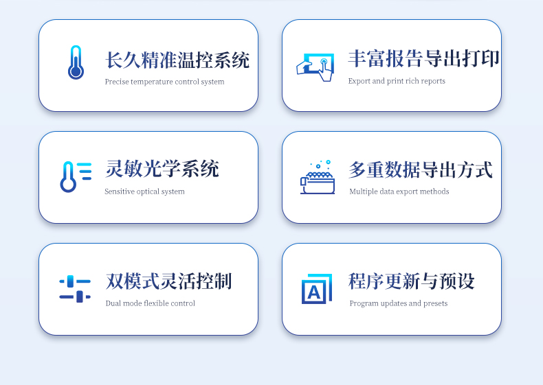 | 1.采用高规格铝合金样品槽,热导性好,耐腐蚀抗氧化,Peltier加热控温,全面的密封设计。无论是样品溶液还是冷凝水,都不会渗漏到样品槽下面的帕尔帖控温元件以及其他电子元件,可有效延长仪器的使用寿命。 | 2.采用高精度PT1000温度传感器,控温精度达到0.01℃,充分保证控温的准确度。 | 3.样品通量:0.2ml单管、0.2ml八联管。 | 4.开放的试剂耗材系统:可以选任何品牌的试剂,适用于标准的0.2ml单管、0.2ml八联管。 | 5.采用蓝色、绿色、红色和黄色四个高强度宽光谱长寿命LED固态光源,确保在整个光谱检测范围内都有很强的光强,提高检测灵敏度,而且不发热,使用寿命长,终身免维护。 | 6.高灵敏度检测器:采用日本进口的高灵敏度的光电倍增管,检测灵敏度更高。 | 7.无需光路校正:扫描系统能确保每孔的信号激发和检测光程都完全一致,无需光路校正,因此无需额外占用一个校正通道,可以实现真正的四通道基因检测。★ | 8.通道数:配置4通道。 | 9.通道串扰:采用高精度窄波带滤光片,极大程度减少通道串扰,软件也可以修正串扰参数。 | 10.检测灵敏度:能检测到单拷贝DNA模板,能清晰区分1000拷贝和2000拷贝的质粒DNA | 11.线性检测范围:10个数量级★ | 12.支持常用荧光染料和探针检测方法,如SYBR Green I,Eva Green,Taqman,FRET,Molecular Beacons,Scorpions,Amplifluor等 | 13.模块温度范围:4-99℃ | 14.操控模式:系统屏幕自带的PCR操作系统或Windows电脑★ | 15.接口:电脑USB连接 | 16.工作噪音:静音技术,运行时**的工作噪音不超过60 dB | 17.操作分析软件 | 17.1可以在运行程序后在定义样品孔,节省实验时间 | 17.2运行程序时可以同时打开其他实验数据结果进行查阅分析 | 17.3软件自动计算基线范围和自动设置阈值线,给用户提供可靠准确的数据结果 | 17.4实验程序设置信息和检测结果可直接打印成实验报告,支持XLS,CSV,WORD等多种文件格式和数据样式导出★ | 17.5同一批实验的结果可以分组进行独立的数据分析,*多可分成2个组 | 17.6提供中英文软件界面。★ | 17.7软件可以无限制安装在多台电脑上,无需付费购买使用权,终身可免费升级。 |