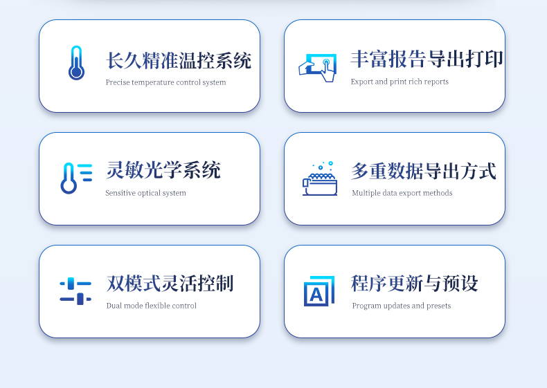 | 1.采用高规格铝合金样品槽,热导性好,耐腐蚀抗氧化,Peltier加热控温,全面的密封设计。无论是样品溶液还是冷凝水,都不会渗漏到样品槽下面的帕尔帖控温元件以及其他电子元件,可有效延长仪器的使用寿命。 | 2.采用高精度PT1000温度传感器,控温精度达到0.01℃,充分保证控温的准确度。 | 3.样品通量:0.2ml单管、0.2ml八联管。 | 4.开放的试剂耗材系统:可以选任何品牌的试剂,适用于标准的8联管或0.2ml PCR单管 | 5.采用蓝色、绿色、红色和黄色四个高强度宽光谱长寿命LED固态光源,确保在整个光谱检测范围内都有很强的光强,提高检测灵敏度,而且不发热,使用寿命长,终身免维护。 | 6.高灵敏度检测器:采用日本进口的高灵敏度的光电倍增管,检测灵敏度更高。 | 7.无需光路校正:扫描系统能确保每孔的信号激发和检测光程都完全一致,无需光路校正,因此无需额外占用一个校正通道,可以实现真正的四通道基因检测。★ | 8.通道数:配置4通道。 | 9.通道串扰:采用高精度窄波带滤光片,极大程度减少通道串扰,软件也可以修正串扰参数。 | 10.检测灵敏度:能检测到单拷贝DNA模板,能清晰区分1000拷贝和2000拷贝的质粒DNA | 11.线性检测范围:10个数量级★ | 12.支持常用荧光染料和探针检测方法,如SYBR Green I,Eva Green,Taqman,FRET,Molecular Beacons,Scorpions,Amplifluor等 | 13.模块温度范围:4-99℃ | 14.操控模式:系统屏幕自带的PCR操作系统或Windows电脑★ | 15.接口:电脑USB连接 | 16.工作噪音:静音技术,运行时**的工作噪音不超过60 dB | 17.操作分析软件 | 17.1可以在运行程序后在定义样品孔,节省实验时间 | 17.2运行程序时可以同时打开其他实验数据结果进行查阅分析 | 17.3软件自动计算基线范围和自动设置阈值线,给用户提供可靠准确的数据结果 | 17.4实验程序设置信息和检测结果可直接打印成实验报告,支持XLS,CSV,WORD等多种文件格式和数据样式导出★ | 17.5同一批实验的结果可以分组进行独立的数据分析,*多可分成2个组 | 17.6提供中英文软件界面。★ | 17.7软件可以无限制安装在多台电脑上,无需付费购买使用权,终身可免费升级。 |