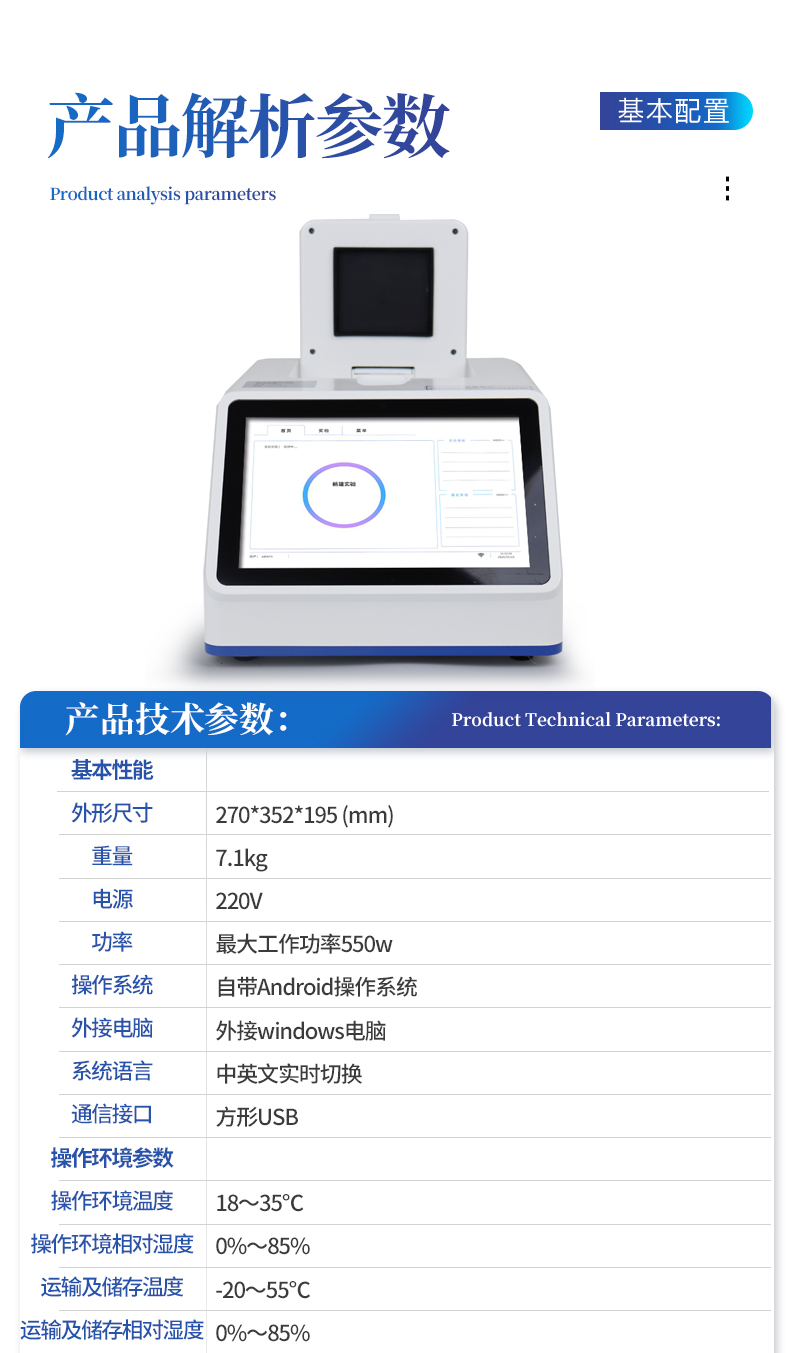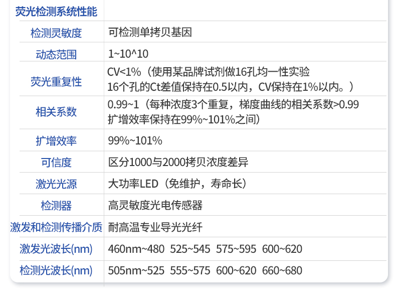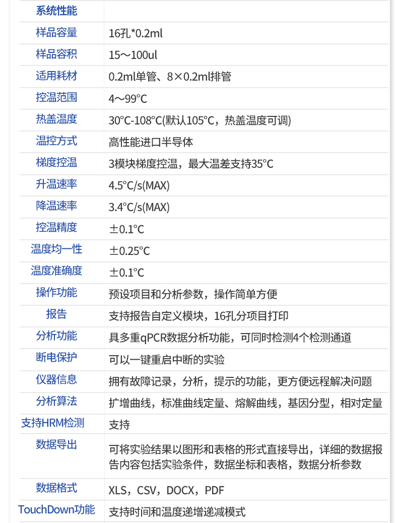 | 基本性能 | 外形尺寸:270*352*195 (mm) | 重量:7.1kg | 电源:220V | 功率:**工作功率300w | 操作系统:自带Android操作系统 | 外接电脑:外接windows电脑(win7系统以上) | 系统语言:中英文实时切换 | 通信接口:方形USB | 操作环境参数 | 操作环境温度:18~35℃ | 操作环境相对湿度:0%~85% | 运输及储存温度:-20~55℃ | 运输及储存相对湿度:0%~85% | 系统性能 | 样品容量:16孔*0.2ml | 样品容积:15~100ul | 适用耗材:0.2ml单管、8×0.2ml排管 | 控温范围:4~99℃ | 热盖温度:30℃-108℃(默认105℃,热盖温度可调) | 温控方式:高性能进口半导体 | 梯度控温:3模块梯度控温,**温差支持35℃ | 升温速率:4.5℃/s(MAX) | 降温速率:3.4℃/s(MAX) | 控温精度:±0.1℃ | 温度均一性:±0.25℃ | 温度准确度:±0.1℃ | 操作功能:预设项目和分析参数,操作简单方便 | 报告:支持报告自定义模块,16孔分项目打印 | 分析功能:具多重qPCR数据分析功能,可同时检测4个检测通道 | 断电保护:可以一键重启中断的实验 | 仪器信息:拥有故障记录,分析,提示的功能,更方便远程解决问题 | 分析算法:扩增曲线,标准曲线定量、熔解曲线,基因分型(SNP),相对定量 | 支持HRM检测:支持 | 数据导出:可将实验结果以图形和表格的形式直接导出;详细的数据报告内容包括实验条件,数据坐标和表格,数据分析参数。 | 数据格式:XLS, CSV, DOCX,PDF | TouchDown功能:支持时间和温度递增递减模式 | 荧光检测系统性能 | 检测灵敏度:可检测单拷贝基因 | 动态范围:1~10^10 | 荧光重复性:CV<1%(使用某品牌试剂做16孔均一性实验,16个孔的Ct差值保持在0.5以内,CV保持在1%以内。) | 相关系数:0.99~1(每种浓度3个重复,梯度曲线的相关系数>0.99,扩增效率保持在99%~101%之间) | 扩增效率:99%~101% | 可信度:区分1000与2000拷贝浓度差异 | 激光光源:大功率LED(免维护,寿命长) | 检测器:高灵敏度光电传感器 | 激发和检测传播介质:耐高温专业导光光纤 | 激发光波长:460nm~480nm , 525nm~545nm, 575nm~595nm ,600nm~620nm | 检测光波长:505nm~525nm , 555nm~575nm , 600nm~620nm , 660nm~680nm |