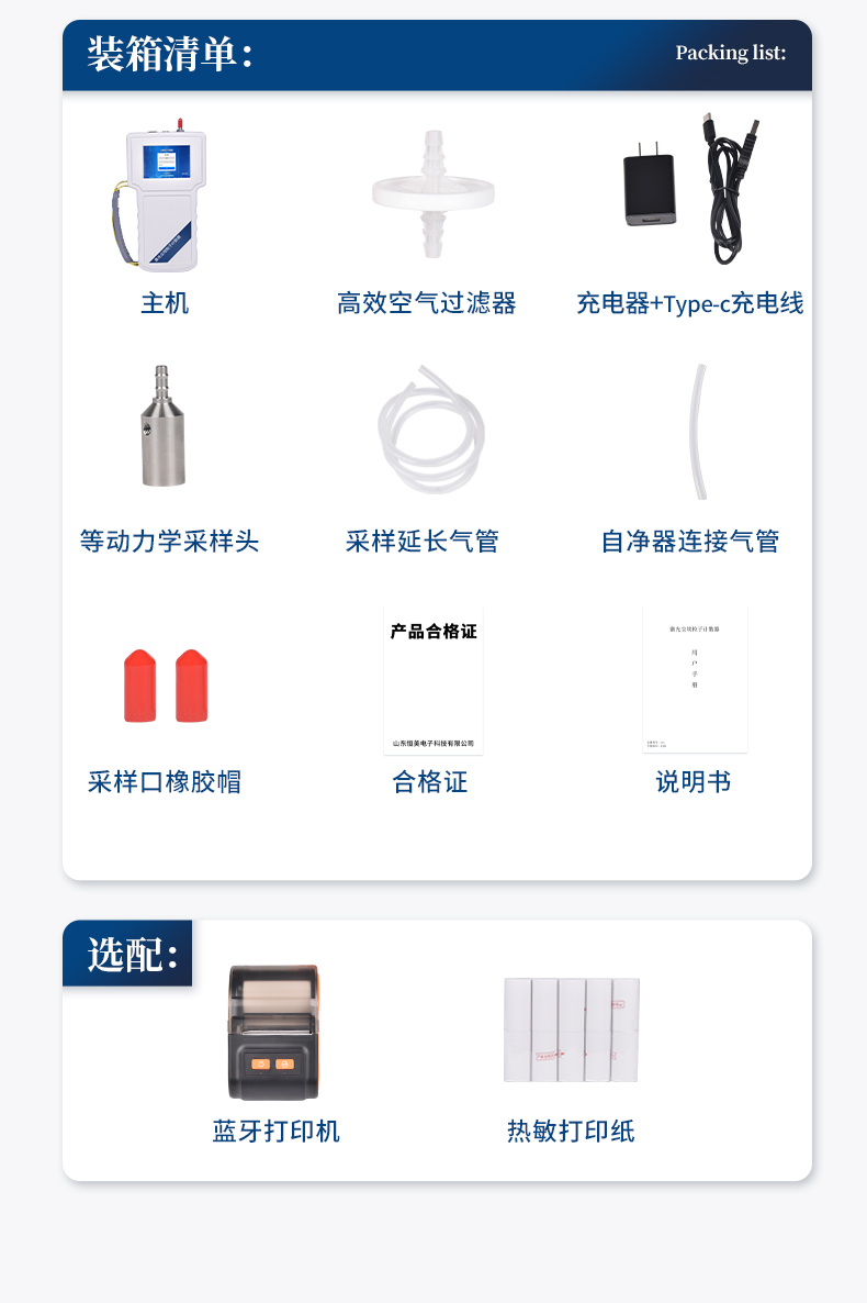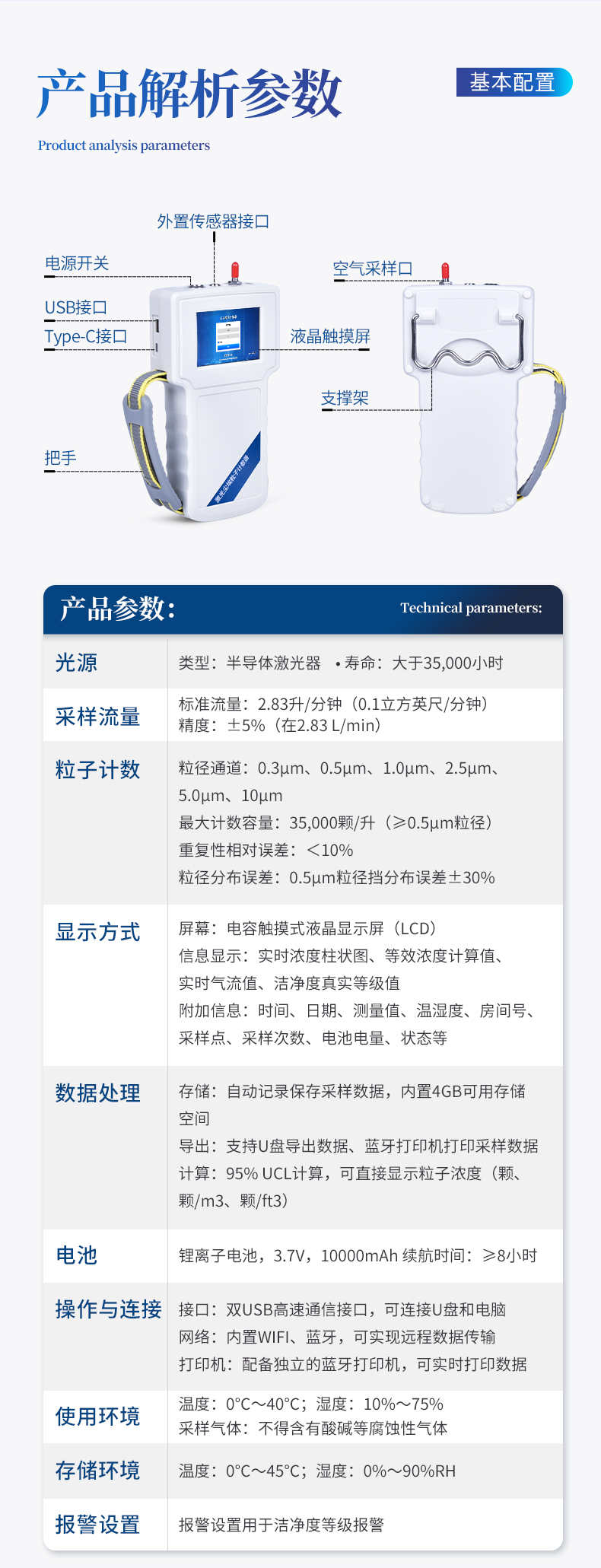 | ◆ 光源 | •类型:半导体激光器 | •寿命:大于35,000小时 | ◆ 采样流量 | 标准流量:2.83升/分钟(0.1立方英尺/分钟) | 精度:±5%(在2.83 L/min) | ◆ 粒子计数 | 粒径通道:0.3μm、0.5μm、1.0μm、3.0μm、5.0μm、10μm | **采样浓度:35000颗/升(颗粒物粒径≥0.5μm) | 重复性相对误差:<10% | 粒径分布误差:0.5μm粒径挡分布误差±30% | ◆ 显示方式 | 屏幕:电容触摸式液晶显示屏(LCD) | 信息显示:实时浓度柱状图、等效浓度计算值、实时气流值、洁净度真实等级值。 | 附加信息:时间、日期、测量值、温湿度、房间号、采样点、采样次数、电池电量、状态等 | 数据内存容量:1--10万条,可查询,可导出。 | ◆ 数据处理 | 存储:自动记录保存采样数据,内置4GB可用存储空间 | 导出:支持U盘导出数据、蓝牙打印机打印采样数据 | 计算:95% UCL计算,可直接显示粒子浓度(颗、颗/m3、颗/ft3) | ◆ 电池 | 类型:锂离子电池,3.7V,10000mAh | 续航时间:≥8小时 | ◆ 操作与连接 | 接口:双USB高速通信接口,可连接U盘和电脑 | 网络:内置WIFI,可实现远程数据传输 | 打印机:配备独立的蓝牙打印机,可实时打印数据 | ◆ 使用环境 | 温度:0℃~40℃ | 湿度:10%~75% | 采样气体:不得含有酸碱等腐蚀性气体 | ◆ 存储环境 | 温度:0℃~45℃ | 湿度:0%~90%RH | ◆ 报警设置 | ◆ 报警设置用于洁净度等级报警。 | 外形尺寸:238*134*58mm(长*宽*高) | 裸机重量:0.95kg | 包装尺寸:450*190*350mm | 包装重量:3.9kg |