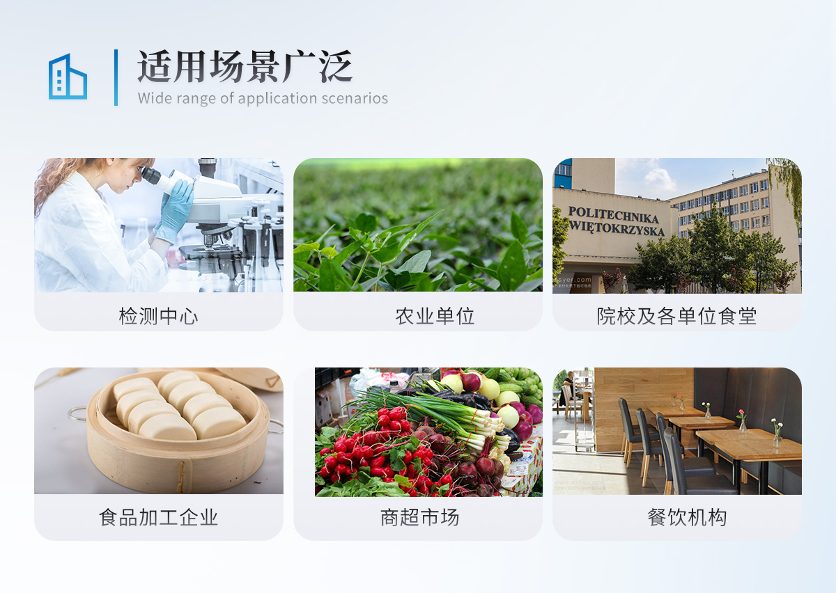 该多功能食品安全检测仪为集成化食品安全快速检测分析设备,广泛应用于市场监管局、食品肉产品深加工企业、学校食堂、卫生部门、畜牧部门、屠宰场、检验检疫部门等单位使用。
