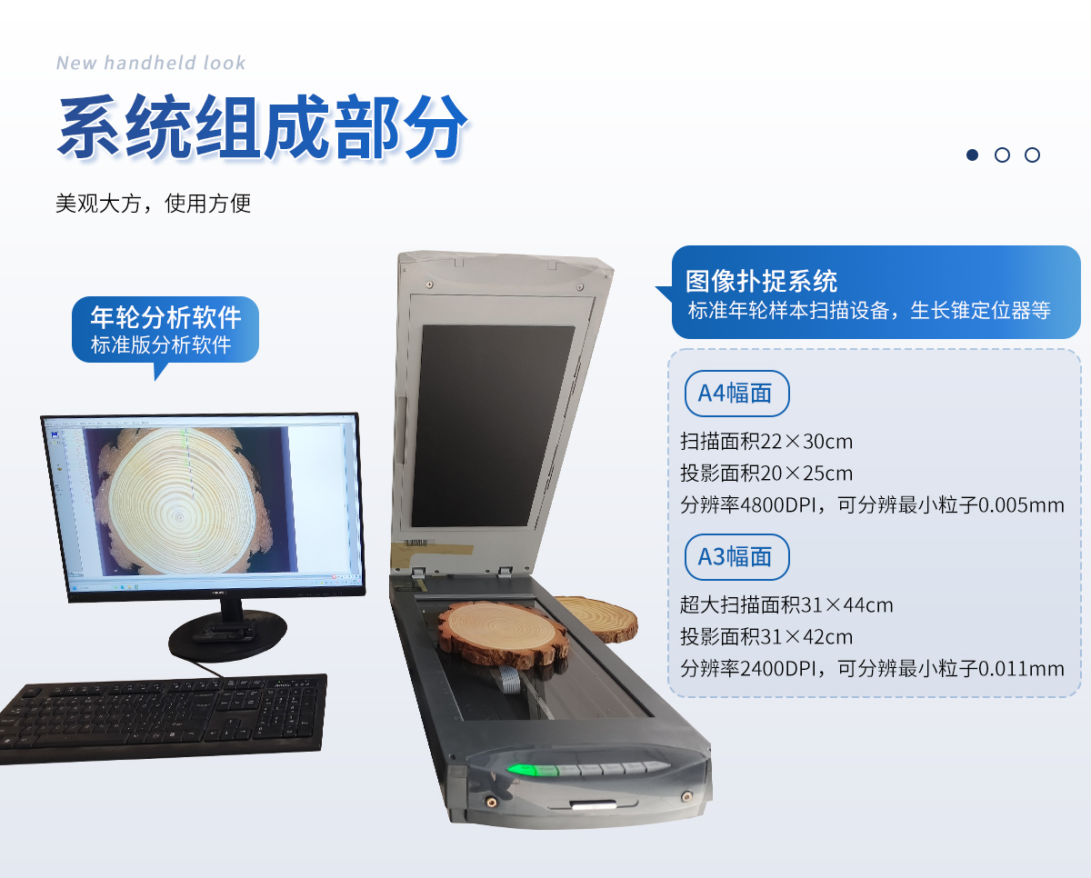 图像扑捉系统:标准年轮样本扫描设备,生长锥定位器等。 A4幅面:扫描面积22×30cm,投影面积20×25cm,分辨率4800DPI,可分辨*小粒子0.005mm A3幅面:超大扫描面积31×44cm,投影面积31×42cm,分辨率2400DPI,可分辨*小粒子0.011mm 年轮分析软件:标准版分析软件。